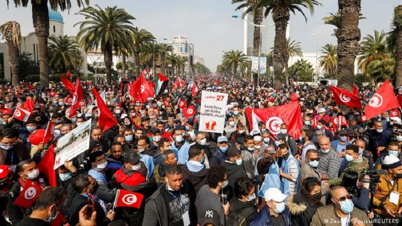 وردد المحتشدون في شارع الحبيب بورقيبة بوسط العاصمة التونسية هتافات تدعو إلى حماية المؤسسات والدستور، والمطالبة بالوحدة الوطنية، على حد تعبيرهم.