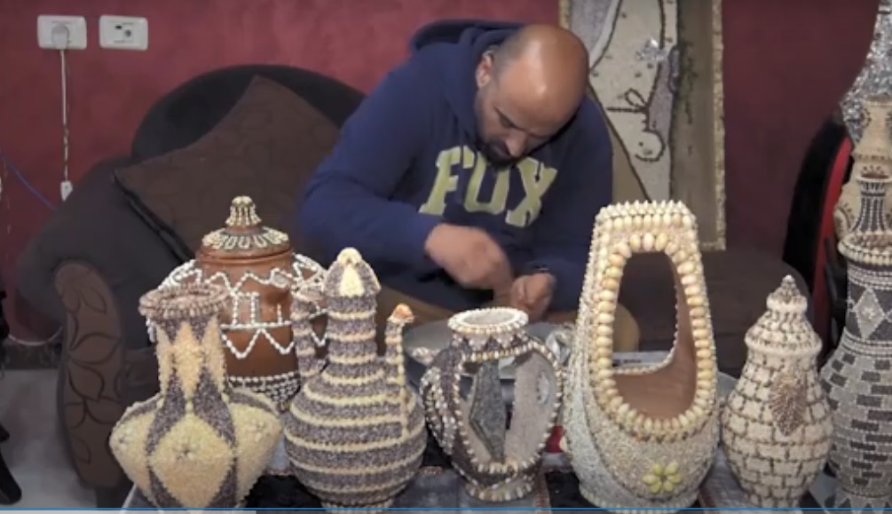 خاص بالفيديو والصور|| كمال المدهون.. فنان فلسطيني يبدع في تزيين الفخار بأصداف البحر