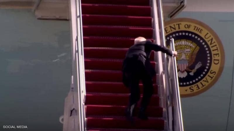 وأظهر مقطع فيديو سقوط الرئيس الأمريكي، 3 مرات متتالية، أثناء صعوده درجات السلم المؤدي إلى طائرة "إير فورس ون"، أمس، المتجهة إلى أتلانتا من جوينت بيس أندروز في ماريلاند.