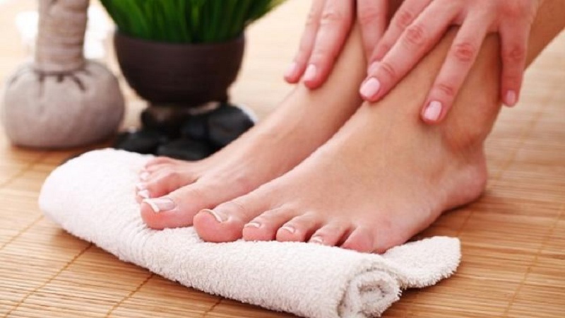 انقعي قدميك في الماء الدافئ لمدة 15-20 دقيقة، ثم جففها جيدًا.