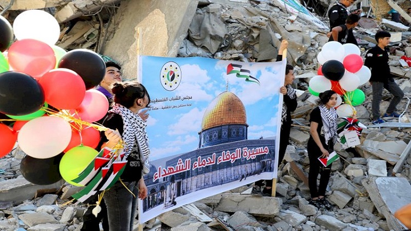 وتخلل المسير رفع العلم الفلسطيني على أنقاض ما دمره الاحتلال بالإضافة إلى إطلاق بالونات تحمل أسماء شهداء العدوان .