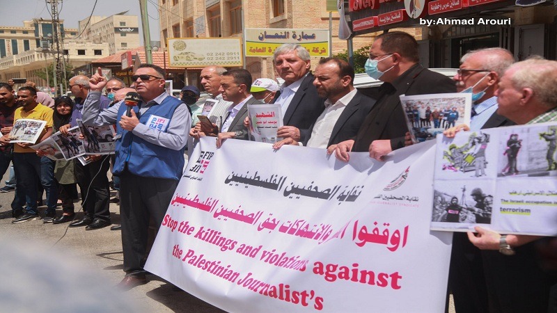 وأدان نقيب الصحفيين، ناصر أبو بكر، في كلمته، خلال الوقفة، ظهر اليوم الإثنين، جرائم الاحتلال بحق الصحفيين والمؤسسات الإعلامية.