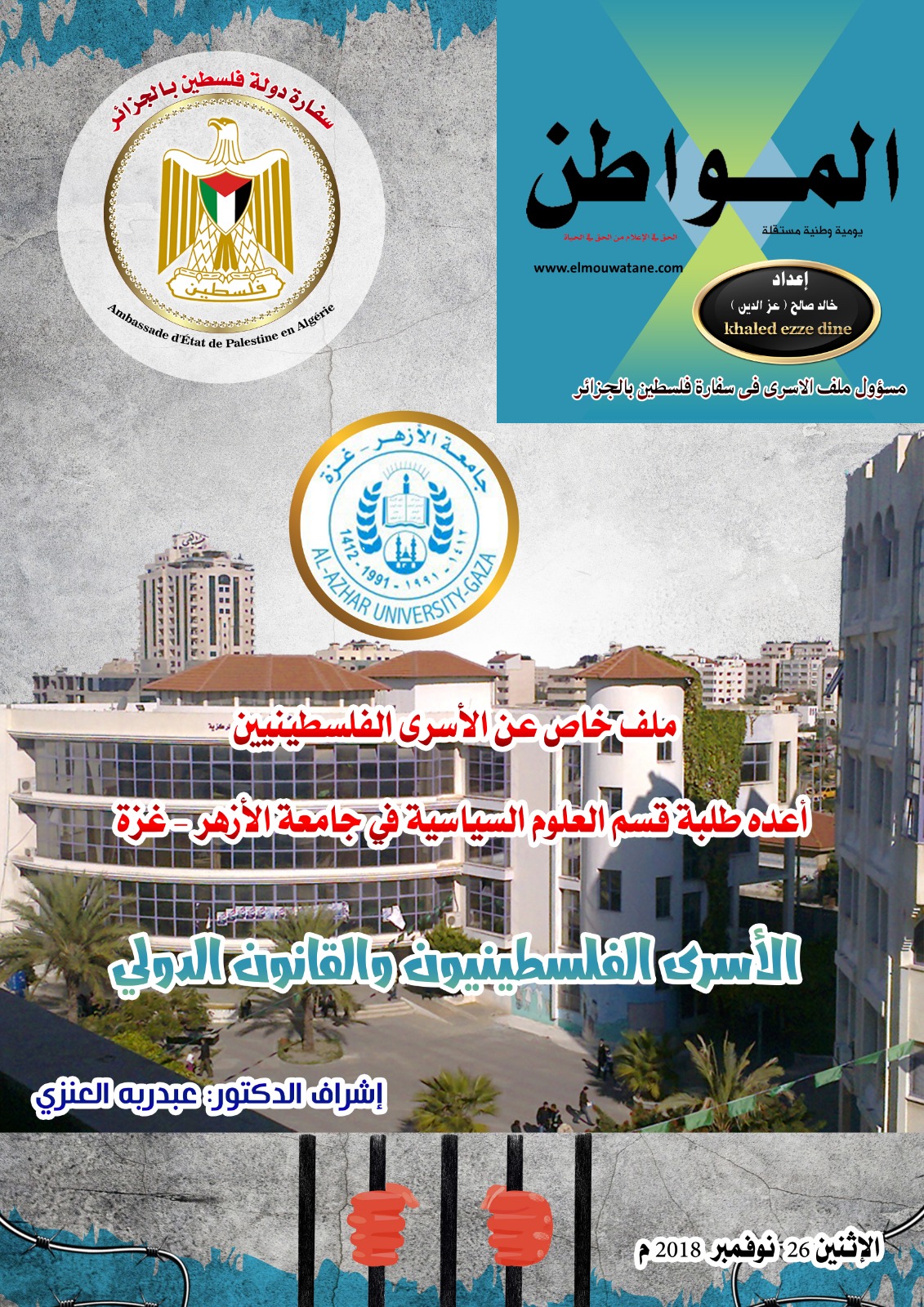 أصدرت جريدة المواطن الجزائرية، اليوم الاثنين، وبالتعاون والتنسيق مع سفارة فلسطين بالجزائر ومن خلال الأسير المحرر، خالد صالح (عزالدين) مسؤول ملف الأسرى الفلسطينيين فى السفارة ، ملفاً خاصاً عن الأسرى الفلسطينيين.