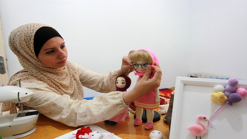 غزة: بأناملها الخفيفة وروحها الإبداعية تحيك الفلسطينية بسمة محمود 33 عامًا، دمى محشوة بالصوف تحاكي من خلالها قصص الأطفال مثل مغامرات سندباد، الأميرة والأقزام السبعة، ليلى والذئب، ماشا والدب.