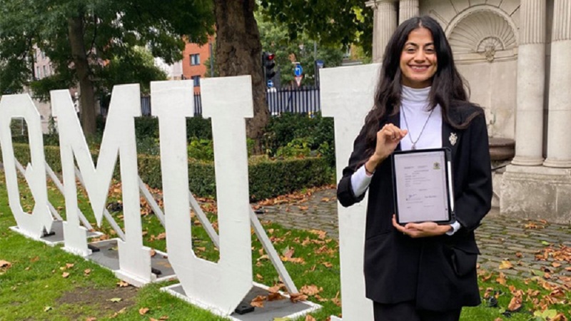 وحصلت أبوسلامة على درجة الامتياز برسالة الماجستير بجامعة كوين ماري في لندن.