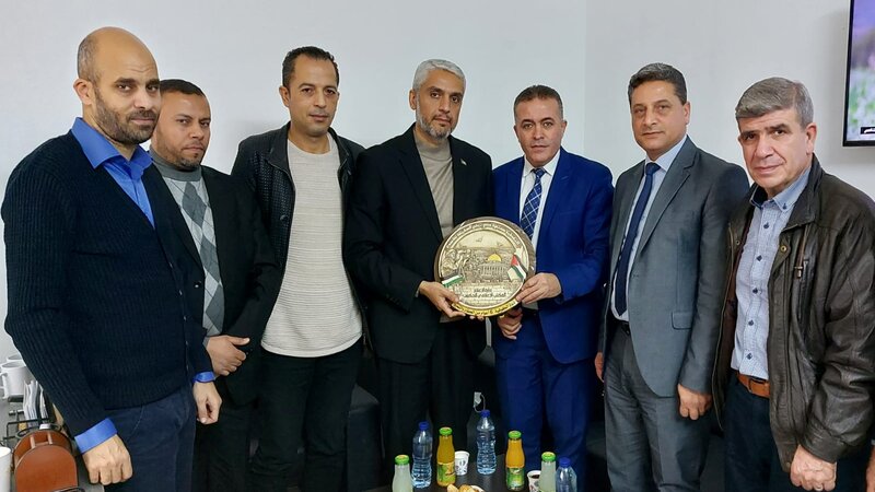 وكان في استقبال الوفد مدير مكتب القناة في فلسطين أحمد حرب، إلى جانب شريف النيرب، وسعود أبو رمضان، وعدد من اعضاء مجلس الإدارة.