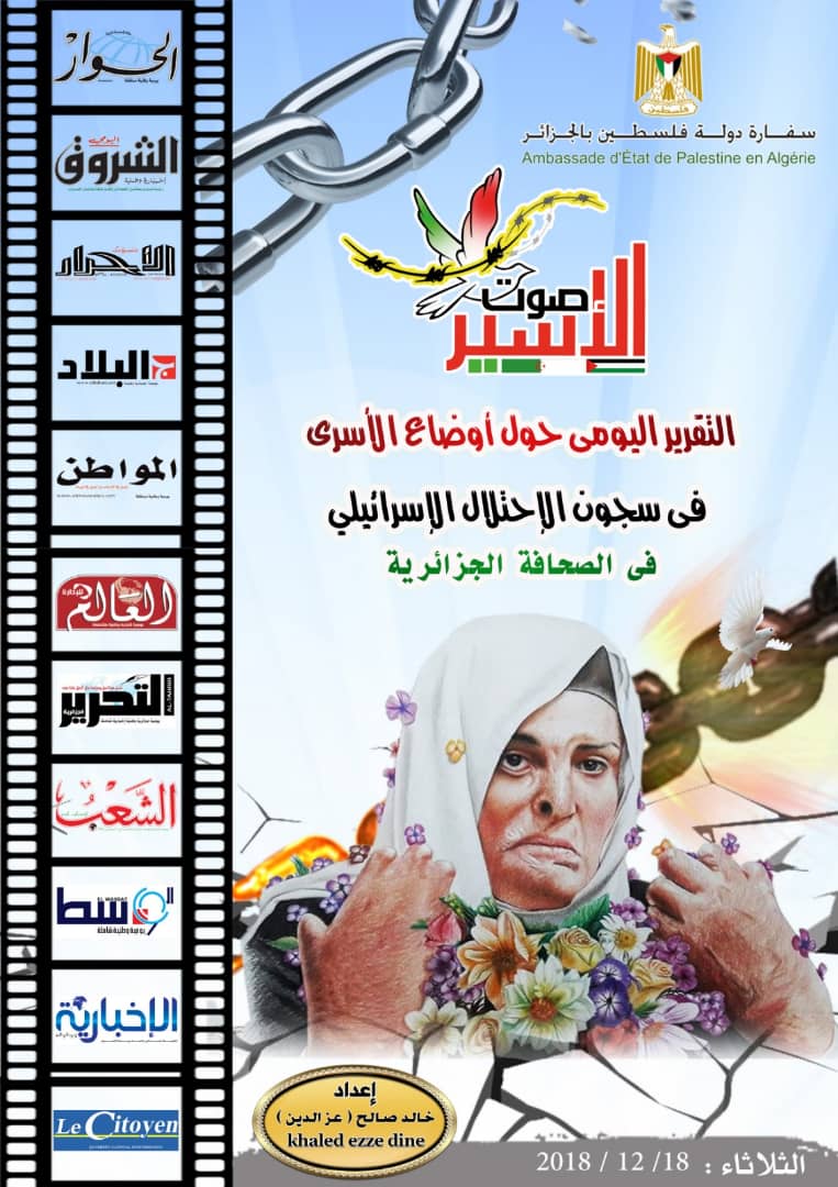 الجزائر: نشرت السفارة الفلسطينية في الجزائر، تقريرًا، اليوم الأربعاء،رصدت خلاله، تناول الصحافة الجزائرية، لأوضاع الأسرى الفلسطينيين فى سجون الأحتلال الإسرائيلي، وحول سياسة الاعتقالات التعسفية اليومية التى يقوم بها فى الاراضى الفلسطينية المحتلة .