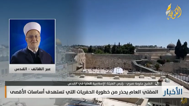 ودعا صبري، خلال لقائه على قناة «الكوفية»، اليوم الإثنين، الدول العربية والإسلامية إلى الضغط على الاحتلال لوقف الحفريات.