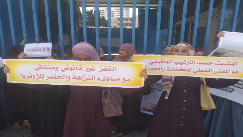 وتواصل المعلمات احتجاهن الذي بدأ في 22 يونيو/ حزيران الماضي، للمطالبة بحل قضيتهن وتحقيق الأمان والاستقرار الوظيفي، وتنفيذ الوعود السابقة التي قطعها مدير الوكالة في غزة توماس وايت، حيث سبق وأكد أن التثبيت سيكون على أساس الكفاءة، حرصًا على جودة التعليم.