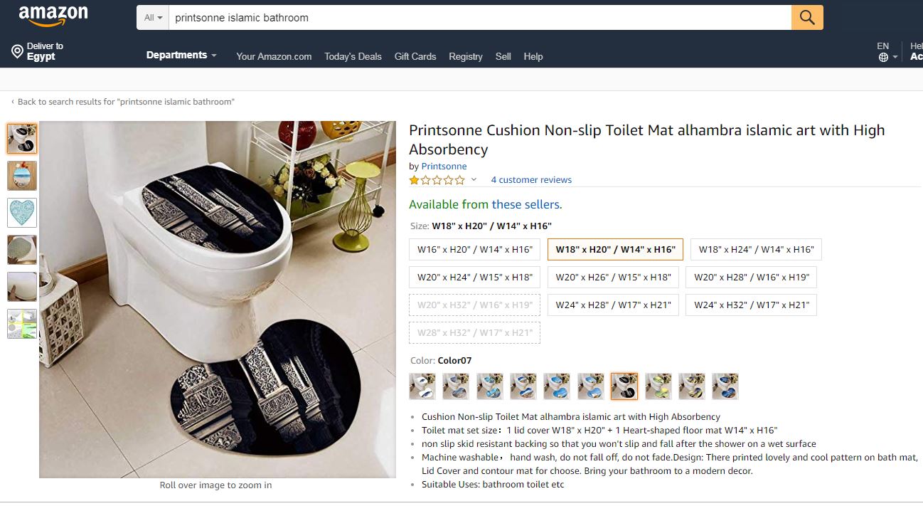 المشاركين على هاشتاج "أمازون تستفز المسلمين"، نشروا صورا من موقع أمازون، الذى يعرض للبيع سجاد ووسائد للمقاعد ومفروشات للمرحاض، تحمل جميعها رسومات لمساجد وأبواب مساجد، إضافة إلى كلمات من آيات القرآن الكريم، كما جاء فى بعض المنتجات المعروضة على أمازون مفروشات للمرحاض والمقاعد مرسوم عليها الحجاب وهو رداء خاص للمرأة المسلمة.