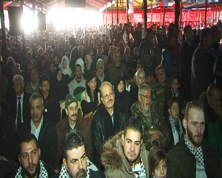 بدأ الحفل بالنشيدين الفلسطيني والسوري، واختتم بتوزيع الدروع التكريمية والمساعدات على أسر الشهداء الذين شاركوا في الدفاع عن المخيمات الفلسطينية في سوريا، إضافة لتوزيع المساعدات المقدمة من جمهورية الشيشان، بعد عدد من الكلمات التي ألقاها عدد من ممثلي الفصائل على رأسهم أحمد جبريل الأمين العام للجبهة الشعبية لتحرير فلسطين القيادة العامة.