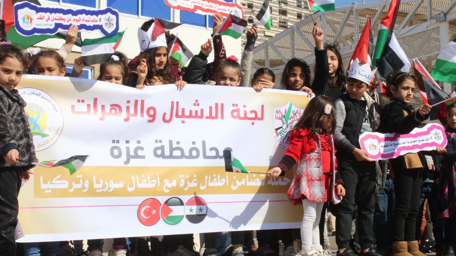 ورفع الأطفال المشاركون في الوقفة لافتات كُتب عليها عبارات تضامنية باللغتين العربية والتركية، كما رفعوا العلم الفلسطيني والسوري والتركي.