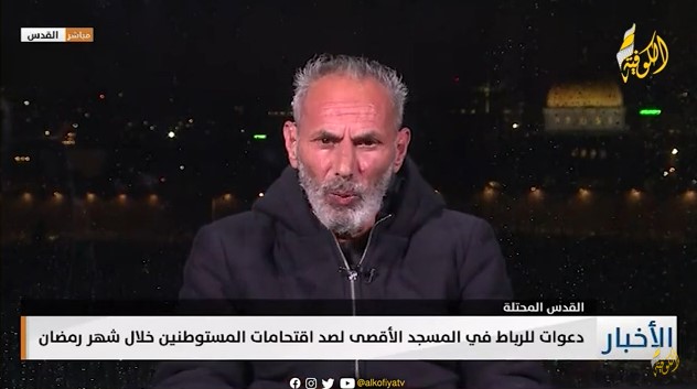 وأضاف، أن حكومة الاحتلال تحاول إشعال الأوضاع في المسجد الأقصى خلال شهر رمضان، داعيا الشعب الفلسطيني كافة إلى الرباط داخل المسجد الأقصى طوال الشهر الكريم من أجل التصدي لاقتحامات المستوطنين.