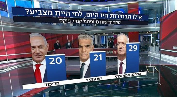 وحصد غانتس أعلى الأصوات في نتائج الاستطلاع بـ 29 مقعدًا، تبعه لابيد بـ 21 مقعدًا، ثم نتنياهو بـ 20 مقعدًا، في حين حصلت الصهيونية الدينية على 11 مقعد، وحزب شاس الحريدي 9 مقاعد، وحزب يهدوت هتوارة 6 مقاعد، وحزب إسرائيل بيتنا 5 مقاعد.