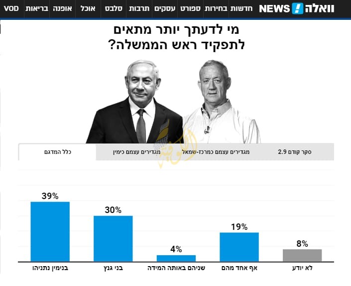 واستمر غانتس في الاستطلاع الحالي بالتفوق على نتنياهو، كمرشح أنسب لتولي منصب رئيس الحكومة، بحصوله على تأييد 41% من المستطلعين مقابل 31% لنتنياهو.