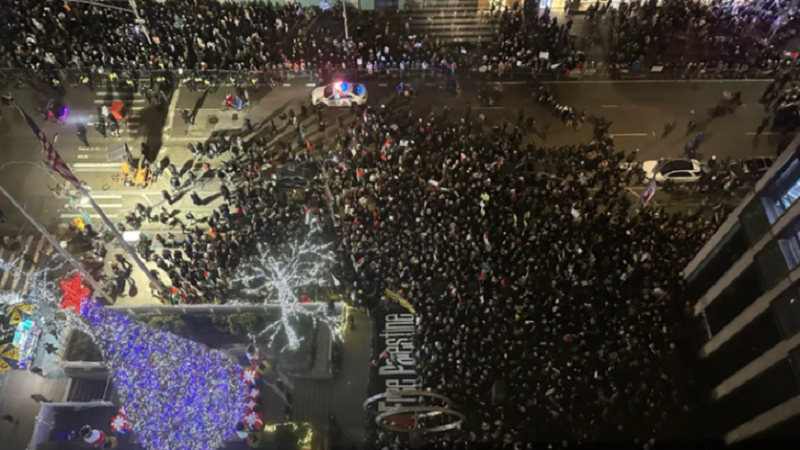 احتجاجات تأييدا لفلسطين بالتزامن مع إضاءة شجرة الميلاد في نيويورك
