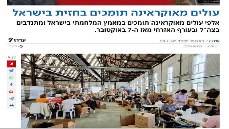 وقالت القناة السابعة العبرية، إن المجموعة الأولى من اللاجئين الأوكران توجهت إلى قواعد الجيش في الثالث عشر من أكتوبر، لتعبئة حصص الإعاشة القتالية وفرز المعدات الطبية في نوبة عمل مدتها اثنتا عشرة ساعة لكل منها.