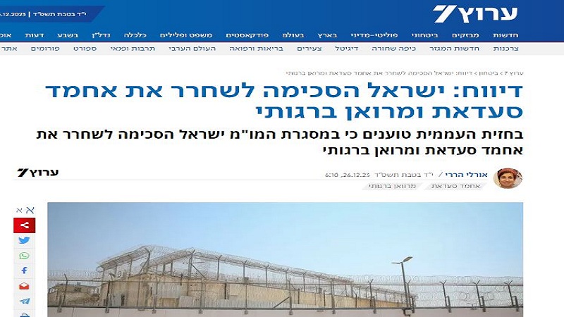 ترجمة للكوفية: ذكرت القناة السابعة العبرية، أن مسؤولا كبيرا في الجبهة الشعبية لتحرير فلسطين أكد أنه ضمن صفقة تبادل الأسرى المرتقبة، وافقت دولة الاحتلال على إطلاق سراح مروان البرغوثي والأمين العام السابق للجبهة الشعبية أحمد سعدات، اللذين يزعم الاحتلال ضلوعهما في التخيطيط لعملية الاغتيال. الوزير رحبعام زائيفي.