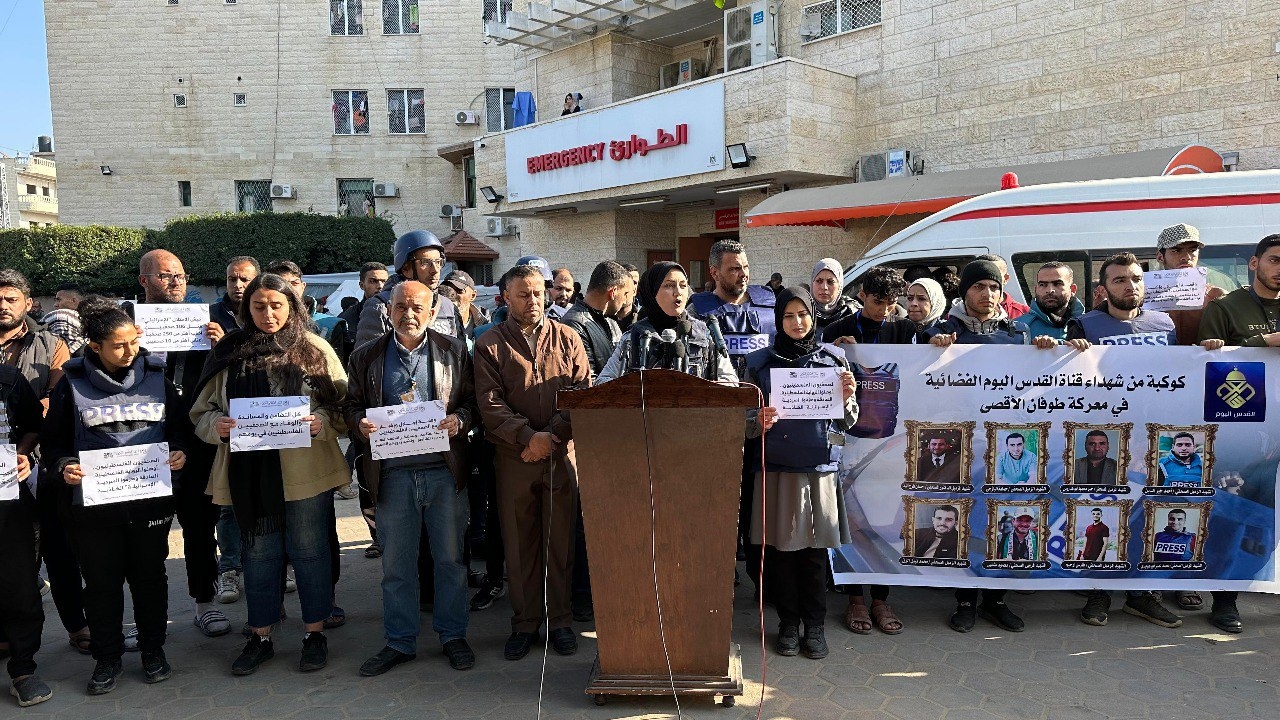 وأردف، "تأتي هذه المناسبة ويأتي معها وقفتنا هذه تقديراً منا للصحفيين والإعلاميين الفلسطينيين، هؤلاء الأبطال الذين ما تركوا مواقعهم لحظة واحدة، بل ظلُّوا صامدين ثابتين في تغطيتهم الإعلامية المتواصلة للأحداث على مدار الساعة".