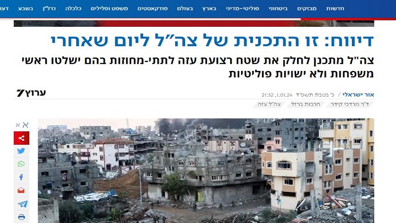 ترجمة للكوفية: كشفت القناة السابعة العبرية عن خطة جيش الاحتلال التي أعدها ويعتزم تقديمها لمجلس الوزراء المصغر "الكابينت"، للمصادقة عليها، والتي تتمثل في تقسيم القطاع إلى أجزاء في الشمال والوسط والجنوب عقب انتهاء العدوان على غزة.