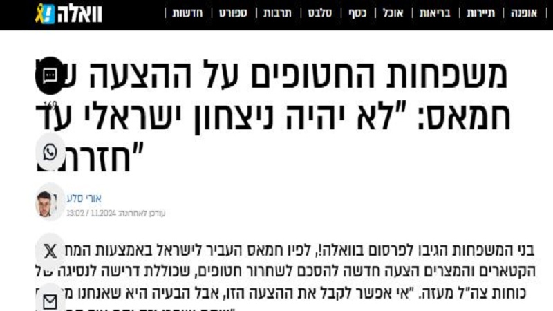 ترجمة للكوفية: نقل موقع "واللا" العبري، عن عدد من أهالي الأسرى الإسرائيليين في قطاع غزة، قولهم إن القضاء على حركة حماس في قطاع غزة ليس نصراً للجيش الإسرائيلي مالم يتم عودة المخطوفين .