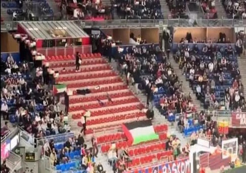 ونادت الجماهير الإسبانية بهتافات مؤيدة للفلسطينيين في مواجهة الحرب الدامية التي يشنها الاحتلال على قطاع غزة، لحظة دخولها إلى صالة كرة السلة في مدينة فيتوريا الإسبانية.