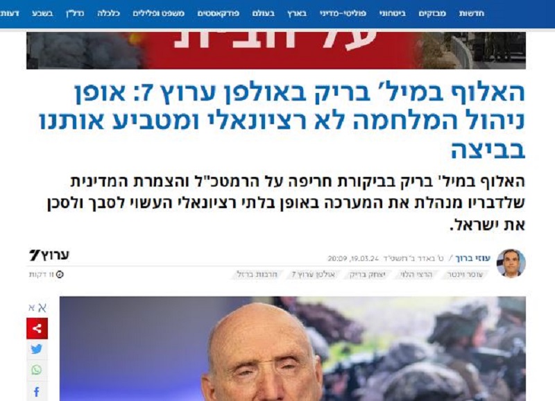 القناة السابعة: اللواء المتقاعد يتسحاق باريك: طريقة إدارة الحرب على غزة غير عقلانية.. وتغرقنا في الوحل