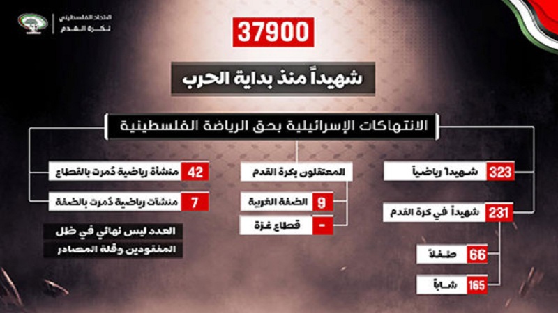 متابعات: أصدر الاتحاد الفلسطيني لكرة القدم، أمس الثلاثاء، تحديثه لعدد شهداء الحركة الرياضية في الضفة الغربية وقطاع غزّة، وسط استمرار حرب الإبادة التي يشنّها الاحتلال الإسرائيلي منذ السابع من تشرين الأول 2023، وذلك بعدما أعلن ارتفاع عدد الشهداء بشكل عام إلى 37900، بينهم 323 شهيداً رياضياً (231 لاعب كرة قدم)، مع إشارته إلى أنّ العدد ليس نهائياً، في وجود مفقودين وقلّة المصادر، على حدّ قوله.