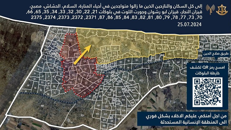 ترجمة خاصة: أعلن المتحدث باسم الجيش الإسرائيل أنه أجرى تعديلا على المنطقة المحددة كمنطقة إنسانية في المواصي بالقرب من خان يونس، في أعقاب معلومات استخباراتية دقيقة تفيد بأن حماس قامت بوضع بنية تحتية في المنطقة التي تم العثور على جثث المختطفين الخمسة .
