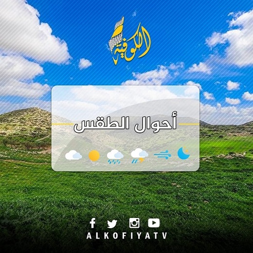 كما يكون الجو يوم غد السبت غائمًا جزئيًا إلى صاف، ويطرأ ارتفاع ملموس آخر على درجات الحرارة لتصبح أعلى من معدلها السنوي العام بحدود 6 درجات مئوية، والرياح شمالية شرقية الى جنوبية شرقية خفيفة الى معتدلة السرعة والبحر خفيف ارتفاع الموج.