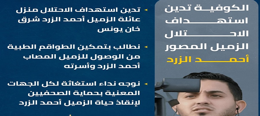ووجهت قناة الكوفية نداء استغاثة لكل الجهات المعنية بحماية الصحفيين لإنقاذ حياة الزميل أحمد الزرد، مطالبة بتمكين الطواقم الطبية من الوصول للزميل المصاب أحمد الزرد وأسرته.
