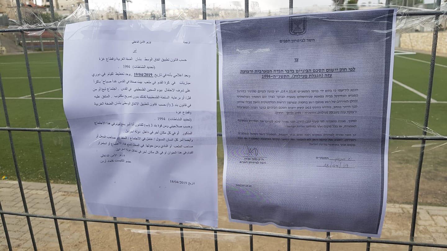 واقتحمت قوات الاحتلال الإسرائيلي، الملعب المزمع إقامة البطولة عليه، وألصقت قرارًا بمنع إقامة البطولة وإغلاق الملعب، مُذيّلاً بتوقيع وزير أمن الاحتلال الداخلي جلعاد أردان.