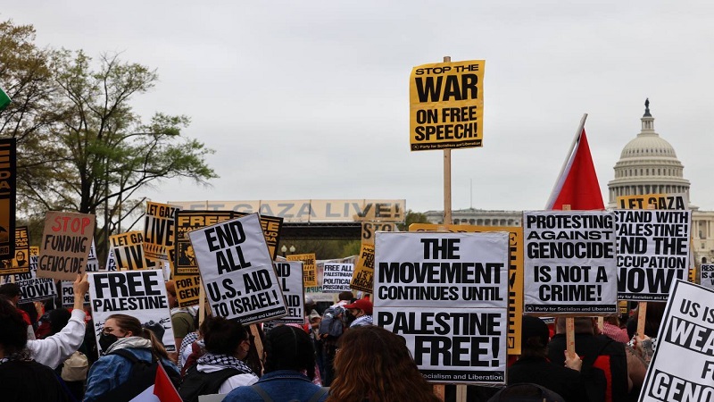 وعبر النشطاء خلال التظاهرة التي تعتبر من الأضخم منذ تشرين الأول/ أكتوبر 2023 عن رفضهم لاعتقال وملاحقة الطلبة الذين يدعمون الحقوق الفلسطينية في الجامعات الأميركية، وضرورة إنهاء الدعم الأميركي العسكري، والمادي لدولة الاحتلال، الذي يساهم في مواصلة "الابادة الجماعية" في غزة.