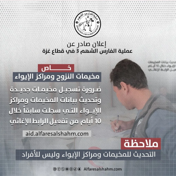 وأوضحت العملية، أن التسجيل مخصَّص فقط للمخيمات ومراكز الإيواء، وليس للأفراد، داعيةً المعنيين إلى الإسراع في التسجيل أو تحديث البيانات لضمان الجاهزية والاستجابة السريعة عند توفُّر المساعدات الإغاثية.
