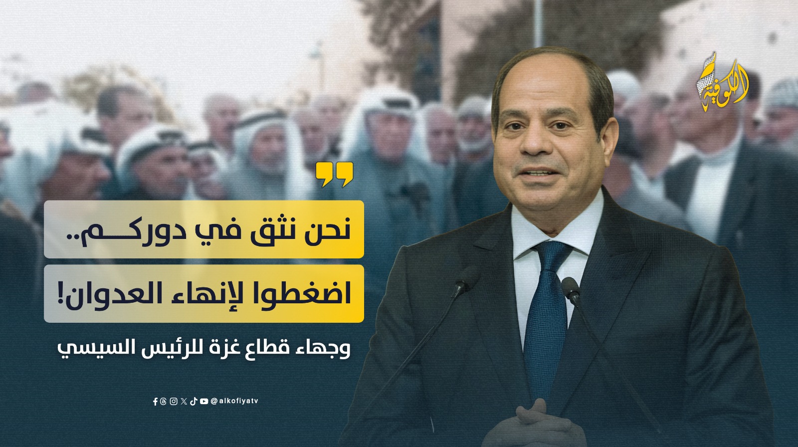 غزة – الكوفية - في ظل استمرار العدوان الإسرائيلي على قطاع غزة، ومع تفاقم الأوضاع الإنسانية، وجه عدد من المخاتير والوجهاء وشخصيات مجتمعية بارزة في قطاع غزة، رسالة مناشدة إلى الرئيس المصري عبد الفتاح السيسي، دعوا فيها إلى التحرك العاجل لوقف الحرب وإنقاذ ما تبقى من القطاع.