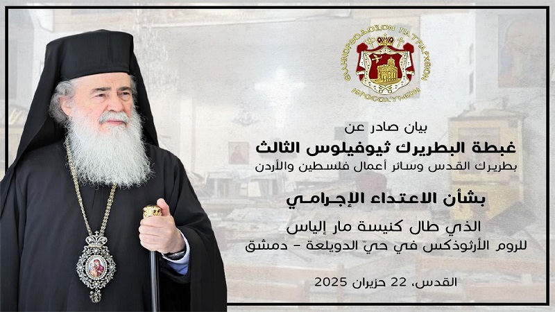الكوفية قال بطريرك القدس وسائر أعمال فلسطين والأردن، غبطة البطريرك ثيوفيلوس الثالث في بيان صدر مساء اليوم الأحد، بوجدانٍ مثقلٍ بالحزن وقلوبٍ متضرعةٍ بالصلاة، تلقّينا بمرارة النبأ المؤلم عن الاعتداء الآثم الذي طال كنيسة القديس مار إلياس في حي الدويلعة بدمشق، حيث استُهدِف الأبرياء وهم في حضرة الرب، ساجدين في بيت الله المقدس.