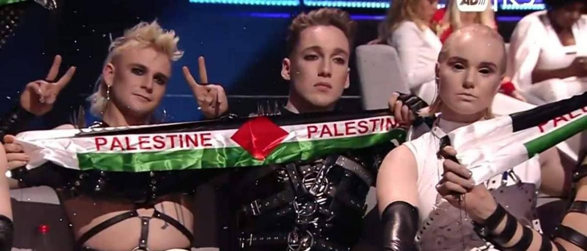 وكالات: فوجئ الحضور والمشاركون في الحفل الختامي لمسابقة الأغنية الأوروبية (اليوروفيجن) برفع الفريق الممثل لدولة آيسلندا العلم الفلسطيني على مسرح المسابقة.