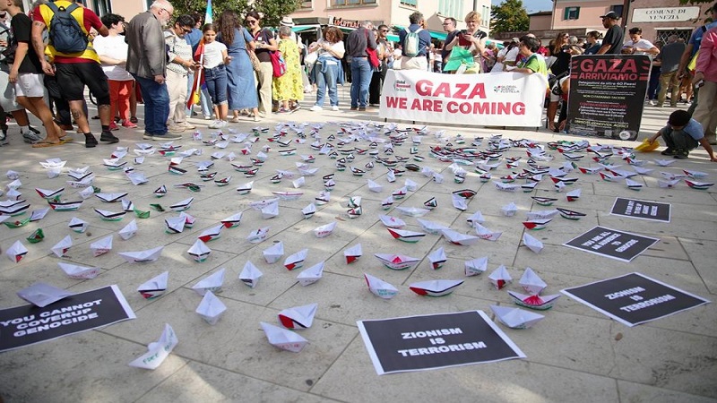 وتجمع آلاف الأشخاص في ساحة سانتا إليزابيتا، بجزيرة ليدو قرب مدينة البندقية، لتسليط الضوء على الإبادة الجماعية التي ترتكبها "إسرائيل" في غزة.