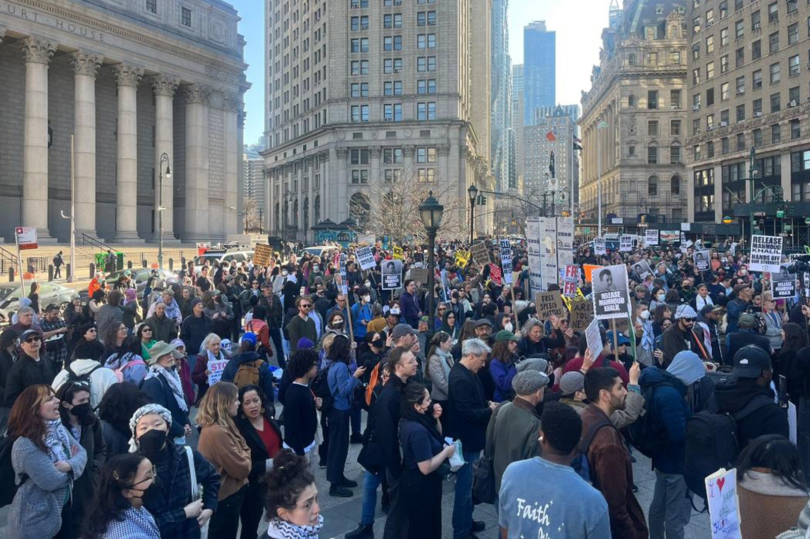 ورفع المتظاهرون لافتات تدين الجرائم المستمرة في قطاع غزة، مرددين هتافات تطالب بالعدالة الدولية، ووقف الدعم العسكري الأميركي لإسرائيل.