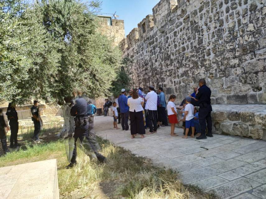 وأدى عشرات المستوطنين يرتدون قمصانا زرقاء طقوسا تلمودية بشكل علني خلال تواجدهم أمام باب القطانين، وأثناء خروجهم من باب السلسلة بحماية شرطة الاحتلال.