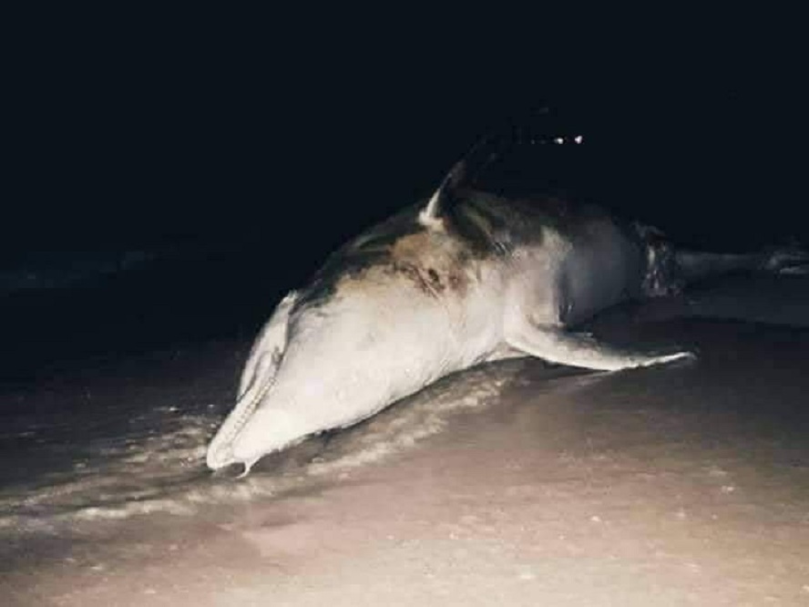 وتُظهر الصورة الدولفين النافق في وقت المساء وهو على شاطئ البحر، وتبدو عليه أثار التآكل.