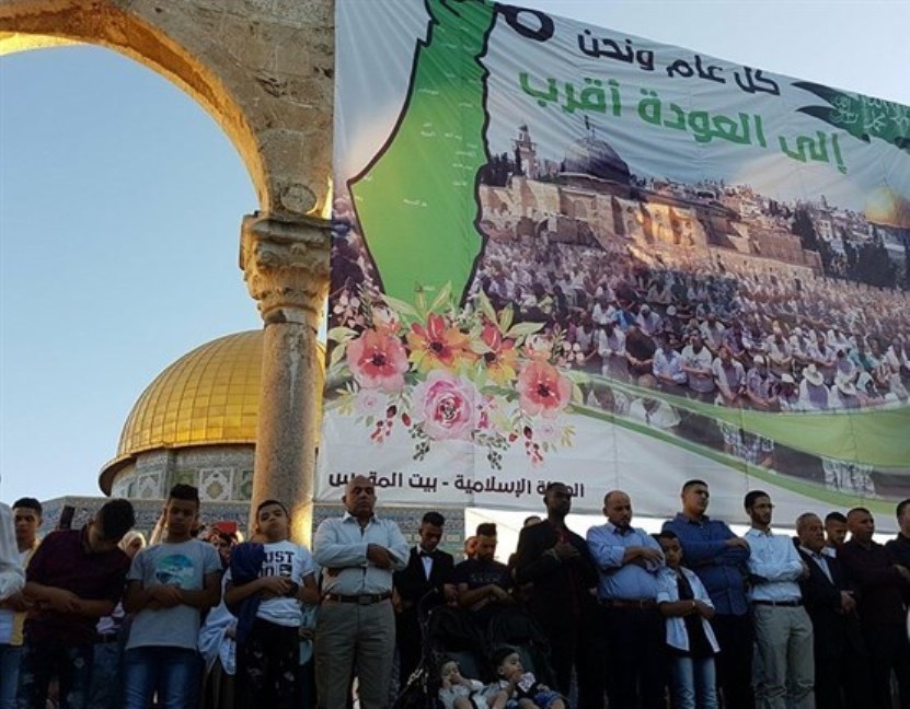 وقام شبان صباح اليوم بتعليق يافطة ضخمة في ساحات الأقصى حملت صورة لقبة الصخرة والمسجد القبلي وكتب عليها "كل عام ونحن إلى العودة أقرب".