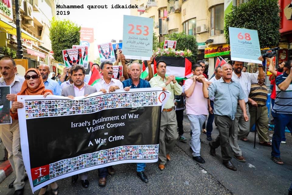 ودعا البايض، الى تشكيل حواضن جماهيرية لاحتضان أهالي الشهداء، مبينا أن الجثامين المحتجزة في مقابر الارقام تبلغ 304 من الشهداء، منهم 51 في الثلاجات، و68 مفقودا، و4 شهداء منهم من الخليل.