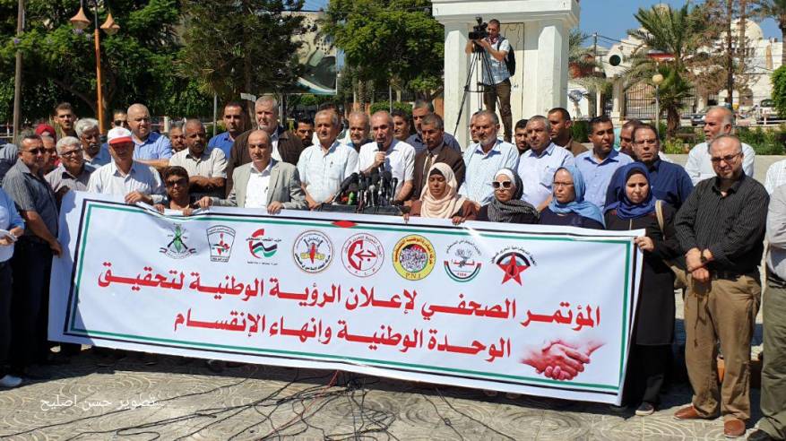 وتقدمت ثمانية فصائل فلسطينية، حركة الجهاد الإسلامي، والجبهتان الشعبية والديمقراطية، وحزب الشعب، والمبادرة الوطنية، وفدا، والجبهة الشعبية القيادة العامة، والصاعقة، يوم الخميس، بـ "رؤية وطنية" لتحقيق الوحدة وإنهاء الانقسام الفلسطيني، استنادًا لاتفاقيات المصالحة الوطنية السابقة في القاهرة وبيروت.