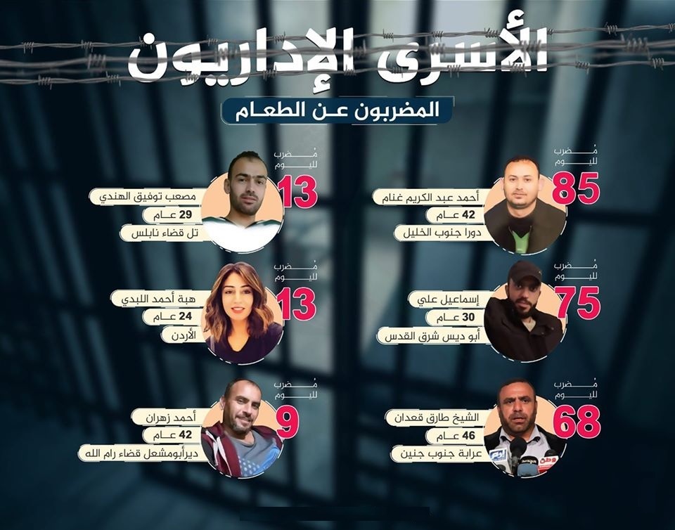 بالأسماء|| 6 أسرى يواصلون إضرابهم عن الطعام احتجاجا على اعتقالهم إداريا