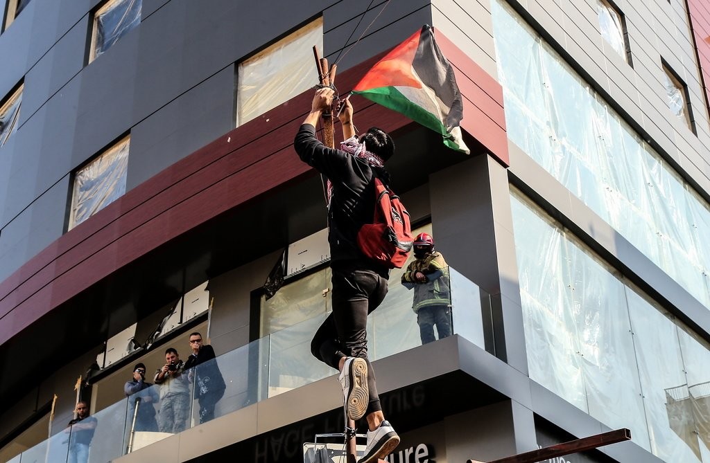 بالفيديو|| اللبنانيون يرفعون العلم الفلسطيني أمام السفارة الأمريكية
