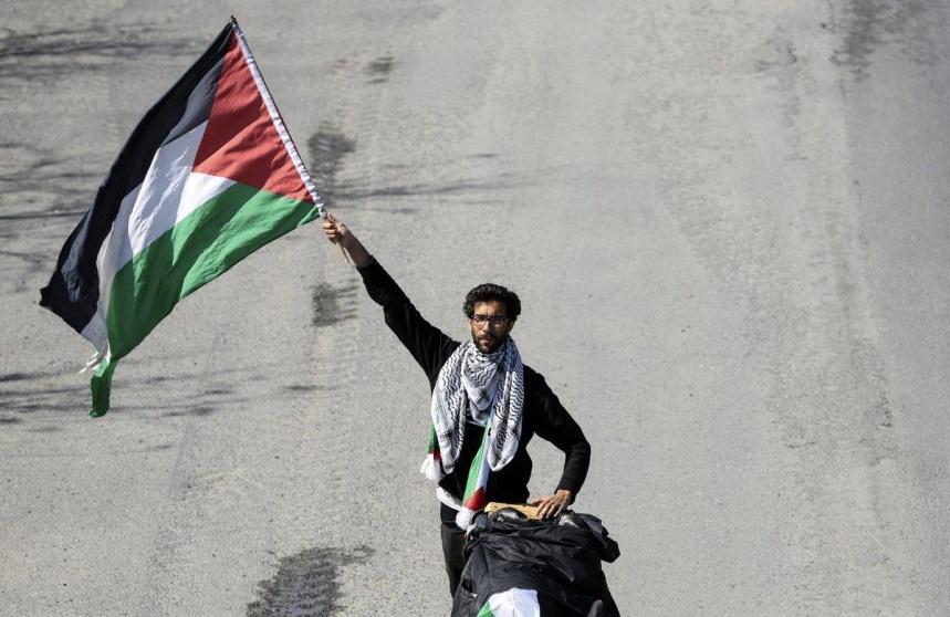 والناشط لادرا الذي يبلع من العمر (25 عاما) قطع رحلته وهو يحمل علمًا فلسطينيًا على ظهره ويضع الكوفية الفلسطينية على كتفيه.