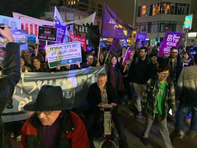 وكالات: نظم مئات النشطاء اليهود والعرب، وأعضاء كنيست، تظاهرة تلبية لدعوة أطلقتها "منظمات يسارية" إسرائيلية، مساء السبت، في مدينة تل أبيب، تنديداً بصفقة ترامب، تحت عنوان "نعم للسلام، ولا الضم".