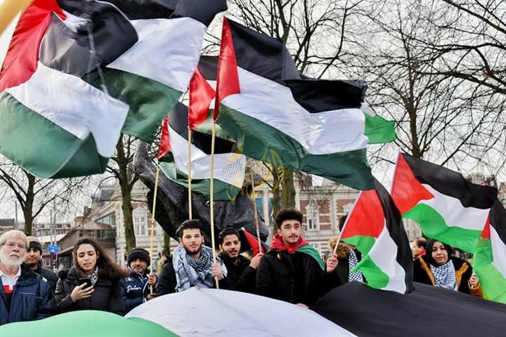 أمستردام: تظاهر المئات من الجالية الفلسطينية والعربية اليوم الثلاثاء، أمام السفارة الأمريكية بالعاصمة الهولندية أمستردام، تنديدا ورفضا لـ"صفقة ترامب".