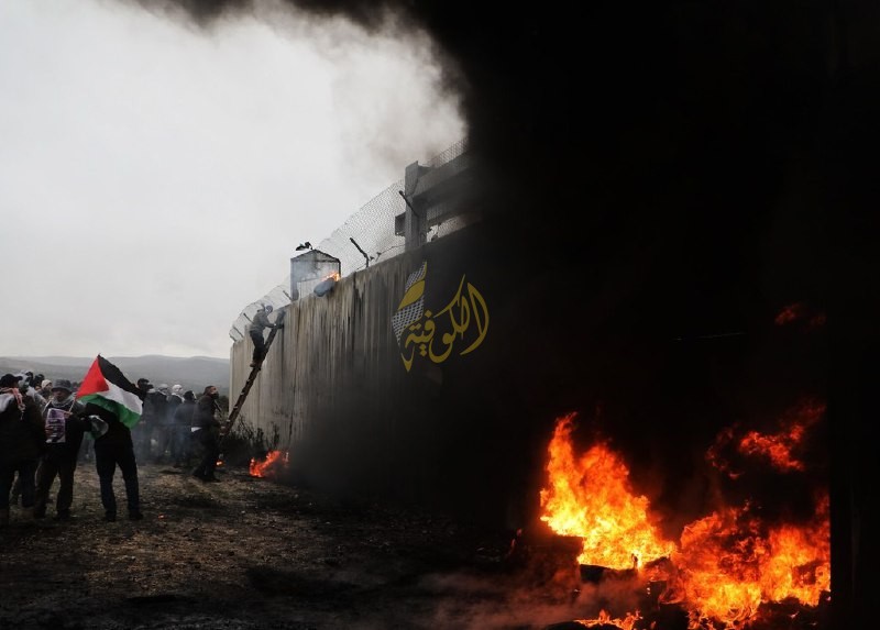 وأضاف الشهود، أن عشرات الشبان تمكنوا من إحراق الجدار العازل القريب من القرية، ورفع العلم الفلسطيني على الجدار.